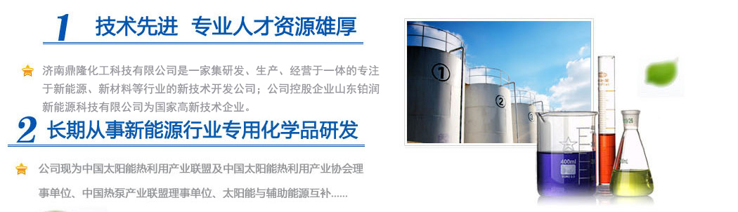 濟(jì)南鼎隆化工科技有限公司是一家集研發(fā)、生產(chǎn)、經(jīng)營(yíng)于一體的專注于新能源、新材料等行業(yè)的新技術(shù)開發(fā)公司;公司控股企業(yè)山東鉑潤(rùn)新能源科技有限公司為國(guó)家高新技術(shù)企業(yè)。擁有雄厚的科研實(shí)力和專業(yè)銷售隊(duì)伍以及多名從事化學(xué)化工專業(yè)的高素質(zhì)人員,其中博士生導(dǎo)師1人,碩士研究生3人。公司現(xiàn)為中國(guó)太陽能熱利用產(chǎn)業(yè)聯(lián)盟及中國(guó)太陽能熱利用產(chǎn)業(yè)協(xié)會(huì)理事單位、中國(guó)熱泵產(chǎn)業(yè)聯(lián)盟理事單位、山東清潔能源供暖產(chǎn)業(yè)聯(lián)盟理事單位、太陽能與輔助能源互補(bǔ)供熱/制冷工程專業(yè)委員會(huì)會(huì)員單位。公司專注于綠色科技,專業(yè)化研發(fā)環(huán)境友好型化工產(chǎn)品,與眾多高校和國(guó)內(nèi)外多家著名化學(xué)品公司保持戰(zhàn)略合作關(guān)系。公司擁有“載能”和“澤能”...更多